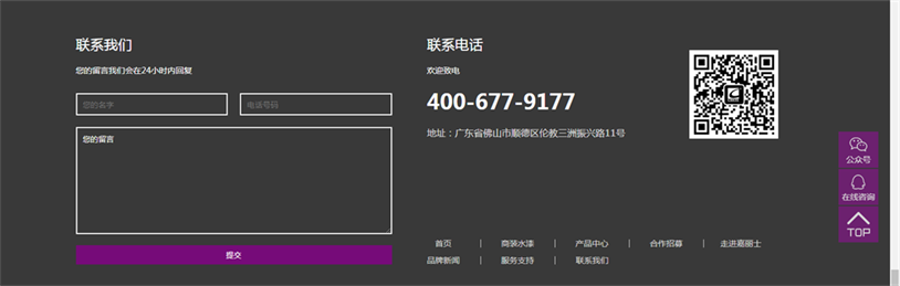 從網(wǎng)頁頂部導(dǎo)航欄“聯(lián)系我們”到底部增設(shè)的多渠道咨詢服務(wù),用戶可以從400服務(wù)熱線、在線咨詢、留言與我們聯(lián)系,我們將針對(duì)不同用戶的需求,打造專屬方案和服務(wù)。用戶還可通過手機(jī)掃描網(wǎng)頁底部的二維碼關(guān)注嘉麗士公眾號(hào),定期獲取嘉麗士最新資訊。此外,新官網(wǎng)還開設(shè)了合作招募通道,面向全國(guó)誠(chéng)招合伙人,攜手共建美好未來!