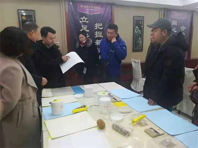 經(jīng)過店面的樣板效果觀摩后,會上還準(zhǔn)備了相應(yīng)的藝術(shù)漆系列產(chǎn)品供客戶親身體驗產(chǎn)品的性能及施工工藝,多樣的產(chǎn)品效果、簡單的施工手法即可得到精美的墻面效果,吸引了與會客戶的興趣!