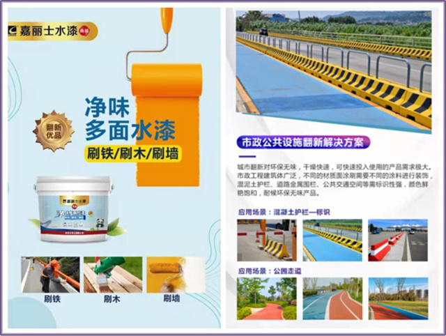 嘉麗士多面水漆,凈味環(huán)保、底面合一、遮蓋力好、可調(diào)千色、耐候耐水性能優(yōu)異,能在金屬面、木飾面、混凝土、墻面、PVC管道面等不同材質(zhì)表面上進(jìn)行施工,可以輕松滿足城市更新改造的各項(xiàng)需求。