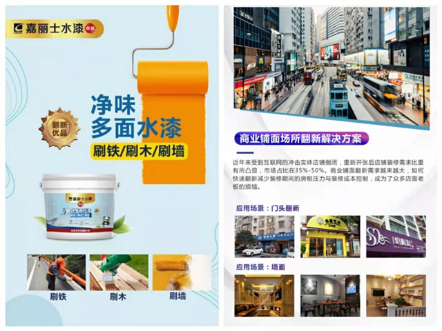 嘉麗士水漆專注于商業(yè)及公共空間涂裝和翻新業(yè)務(wù),產(chǎn)品凈味環(huán)保,施工過程不產(chǎn)生刺激性氣味,裝修不歇業(yè),即刷即入住,色彩保色性好,施工簡(jiǎn)單、周期短,為店鋪商裝翻新帶來了福音。