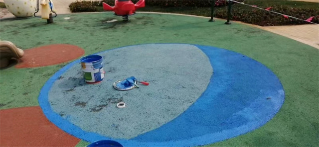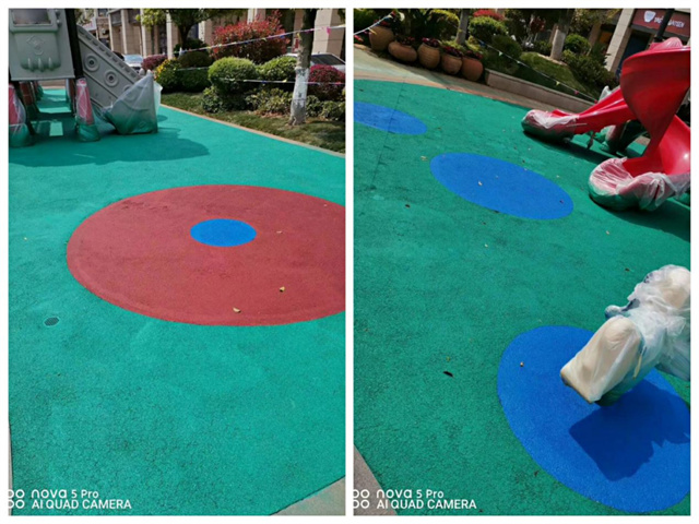 涂裝后的兒童游樂區(qū)地坪色彩鮮艷,藍、紅、綠搭配圓形圖案,充分展現了童趣,與周邊游樂設施一起,構成了充滿夢幻童話的空間!