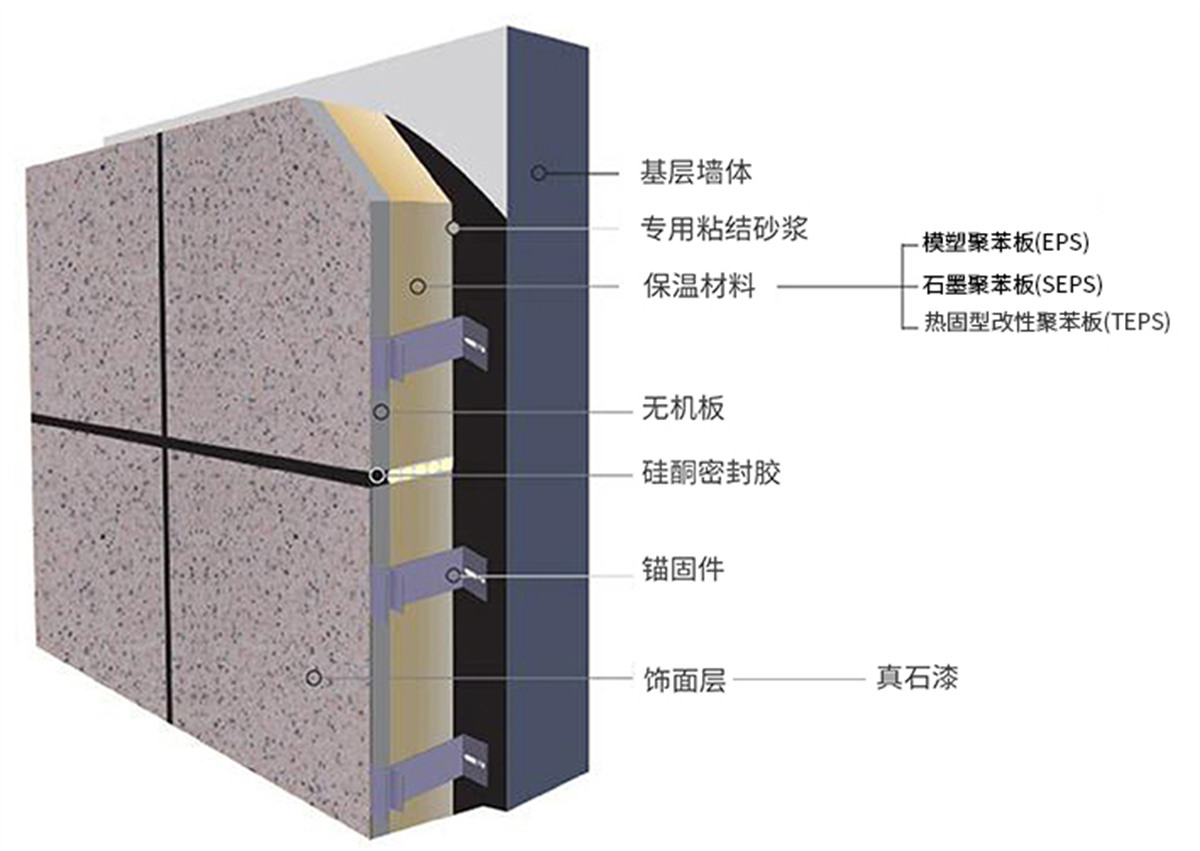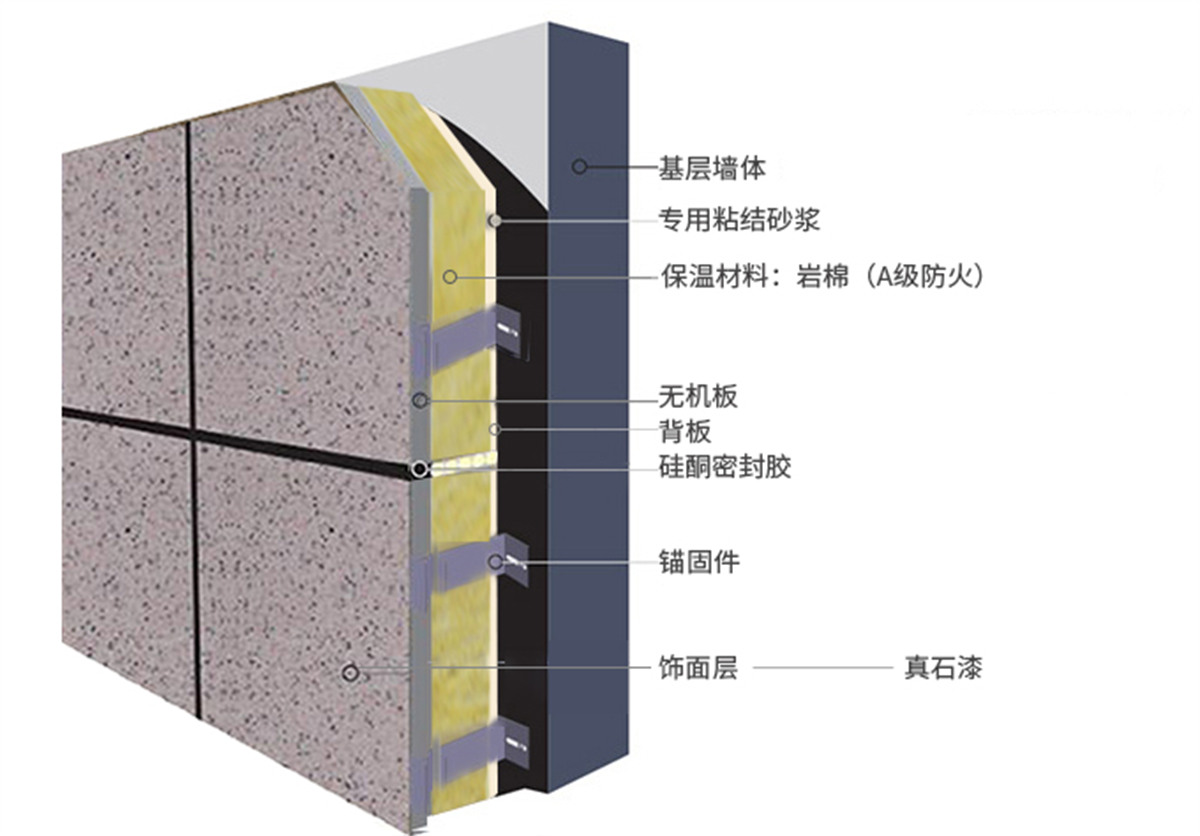 真石漆保溫裝飾一體板選用高密度、高強(qiáng)度A1級無機(jī)板為基材,通過精砂、滲透封閉、界面處理、飾面噴涂(輥涂)、固化、養(yǎng)護(hù)、復(fù)合等多道現(xiàn)代化生產(chǎn)工序加工成型。真石漆飾面表面層厚實(shí),具有真實(shí)的自然色澤、質(zhì)感,給人以高雅、和諧、莊重之美感。