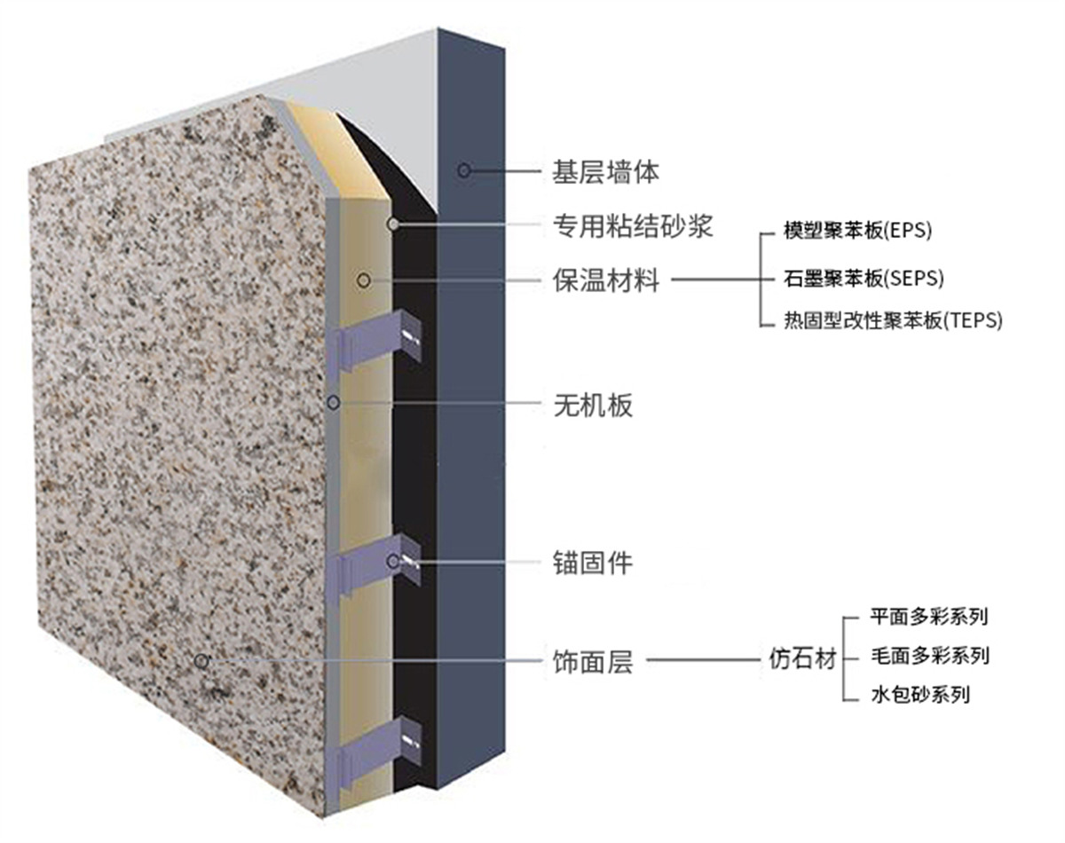 無機板類多彩仿石保溫裝飾一體板選用高密度、高強度A1級無機板為基材,通過精砂、滲透封閉、界面處理、飾面噴涂(輥涂)、固化、養(yǎng)護、復(fù)合等多道現(xiàn)代化生產(chǎn)工序加工成型。