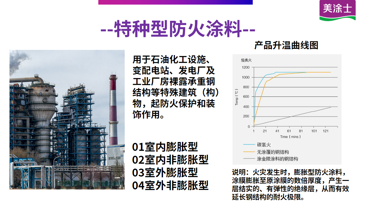 適用特殊建筑物(如石油化工設(shè)備、變配電站等)室內(nèi)鋼結(jié)構(gòu)表面的防火保護(hù)。